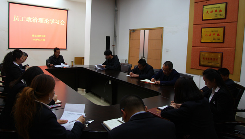 3月23日下午,博览园党支部在动物馆会议室举行了2018年度第六次政治理论集体学习会,学习了习近平总书记在十三届全国人大一次会议上的重要讲话精神、校机关党委2018年工作要点、全国优秀教师曲建武及“三秦楷模”陈士橹、柯小海、刘永生同志的先进事迹。会议由支部书记傅朝荣主持,全体职工参加了此次会议。